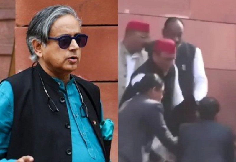 कांग्रेस सांसद थरूर फोन पर बात करते हुए संसद की सीढ़ियों पर लड़खड़ाकर गिरे… अखिलेश यादव ने संभाला